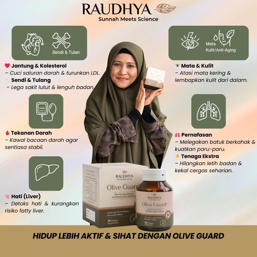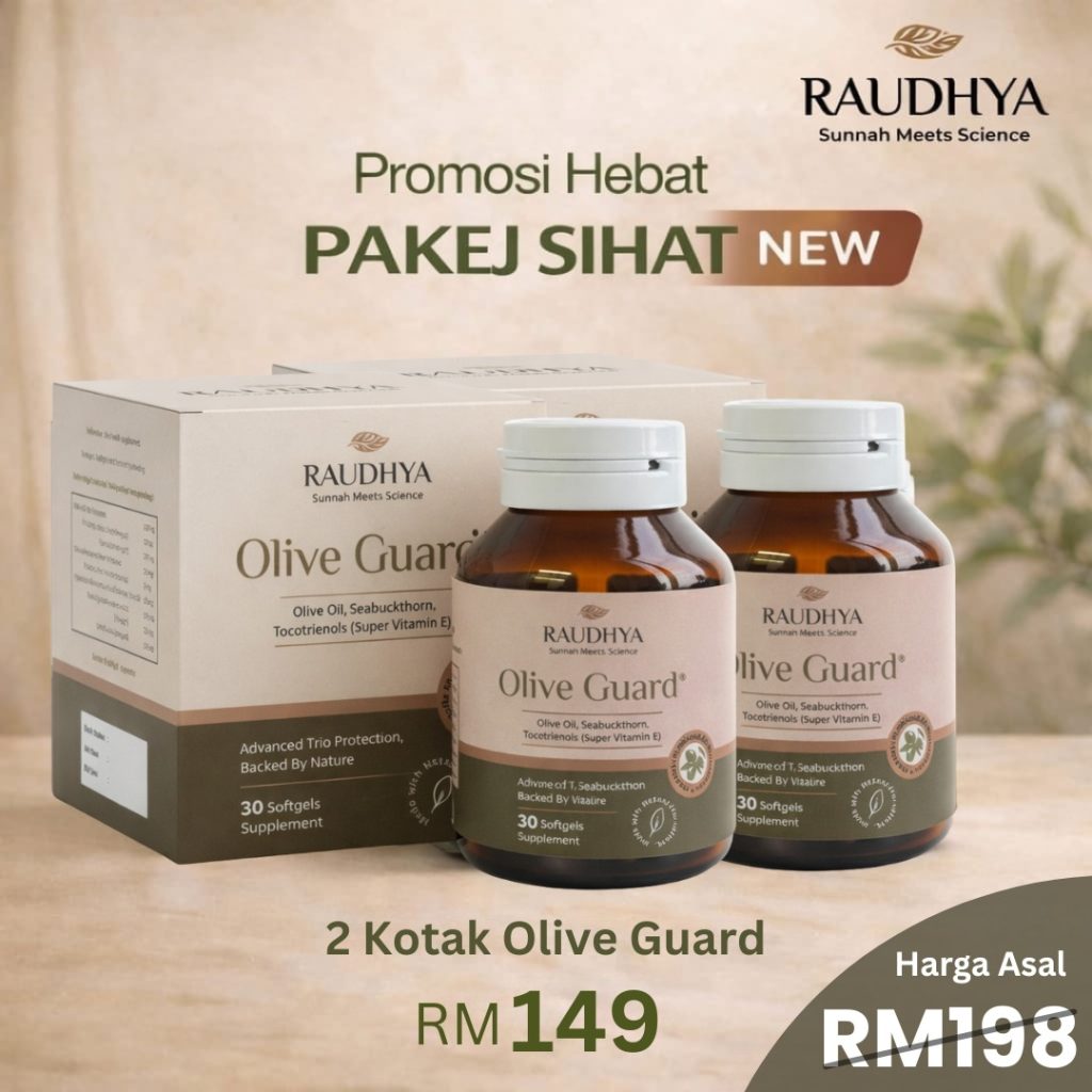 Raudhya OliveGuard+ Diperkaya Bahan Aktif Polyphenols, Tocotrienols (Super Vitamin E) & Omega Aktif Menyokong Kawalan Gula, Kolesterol & Tekanan Darah